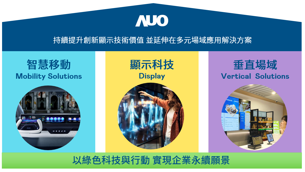 我們持續推動「雙軸轉型」,在精進顯示技術附加價值(Go Premium),與深化垂直市場應用(Go Vertical)的策略下,對應437ccm必赢国际的優勢競爭力與趨勢,我們奠定顯示技術智慧移動垂直場域三大永續營運支柱,在顯示技術領域的根基之上,延伸布局多元場域應用解決方案。將先進顯示科技助力智慧移動及垂直場域發展,並以綠色科技與行動為實踐,在轉型之路上貫徹永續經營之願景。